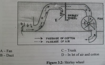 The fan, which is situated at A would blow air through the duct B. This would tend to create a vaccum in the trunk C. Air can enter the system only at position D. A low pressure near vaccum is created inside C. This would result in air rushing through D due to atmospheric being higher than that inside the trunck C. The shirley wheel consists of a section of ducting by the insertion of a rotating perforated disc. This disc or wheel rotates at about 70 rpm. This is used to separate cotton, On reaching the Shirley wheel, the air is able to pass through the perforations in the wheel causes the cotton is arrested & dropped into the space below. The rotation of the wheel causes the cotton to be carried downwards through a lightly spring loaded control flap E. Cotton falls freely under gravity. The fine dust passes with the air through the perforations of the wheel. This is then discharged with air to the dust settling chamber or dust filtration system.