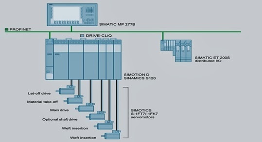 - Constant thread tension control during the winding and unwinding process, correct provision of thread and accurate positioning when entering the weft are closely coupled to the process control and are processed synchronously with the machine cycle. These control functions are performed by a SIMOTION D4x5‑2.